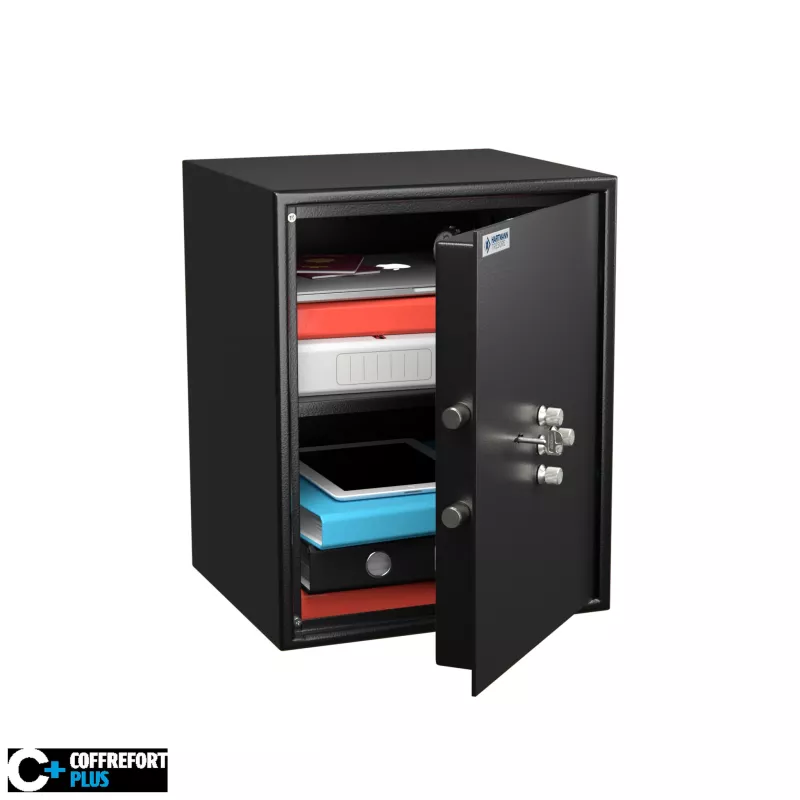 Le coffre-fort de sécurité Hartmann Tresore HT 60 avec serrure à clés et combinaison mécanique offre un double niveau de sécurité parfaitement adapté aux environnements professionnels exigeants.