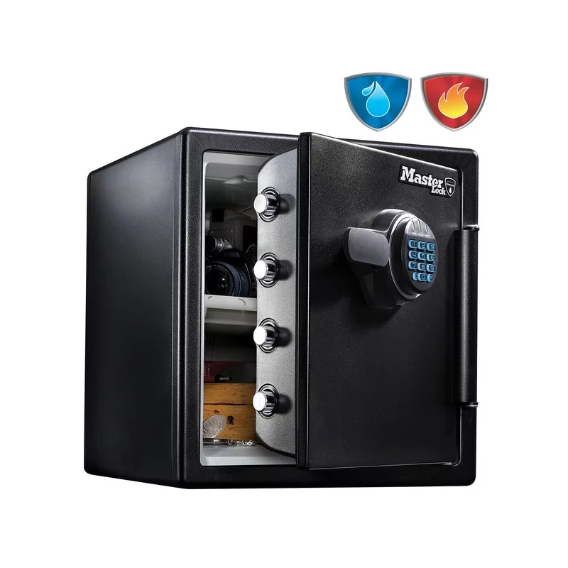 Le grand coffre-fort à combinaison électronique Master Lock nº LFW123FTC est conçu pour protéger documents, supports numériques et autres objets de valeur (bijoux, espèces, disques durs externes, etc.) contre les incendies, inondations et vols. En acier, certifié UL/ETL, ce coffre-fort offre une résistance au feu de 60 minutes à 923 °C et à l'eau en cas d'inondation.